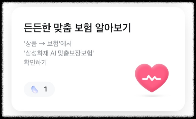 [상품] 누르고 [보험] 항목에서 [삼성화재AI맟춤보장보험] 누르면 미션 끝!